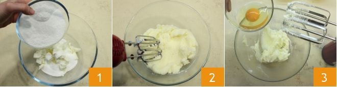 Para preparar os cupcakes de mel decorados, comece preparando a massa base: coloque em uma tigela a manteiga amolecida em pedaços e o açúcar 1 e trabalhe a mistura até obter um creme 2; adicione o ovo 3 e continue a trabalhar os ingredientes até obter uma mistura clara e espumosa.