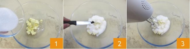 Para preparar os cupcakes optical, coloque em um recipiente o açúcar refinado junto com a manteiga amolecida à temperatura ambiente cortada em pedaços 1. Corte a fava de baunilha no sentido do comprimento; extraia as sementes raspando com uma faquinha e adicione-as à tigela 2, juntamente com uma pitada de sal. Comece a trabalhar os ingredientes até formar um creme 3