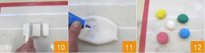 Enquanto isso, você pode preparar as decorações com a pasta de açúcar: com uma espátula, divida-a em pequenos blocos 10, faça uma pequena cavidade e adicione os corantes alimentares conforme a tonalidade desejada 11; amasse bem com as mãos para obter uma coloração uniforme 12.