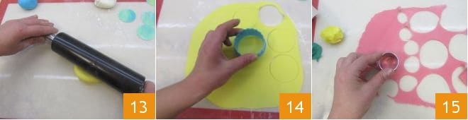 Polvilhe levemente com açúcar de confeiteiro o tapete de silicone e estenda a pasta de açúcar amarela 13 em um disco fino e corte discos de 6 cm de diâmetro 14; depois estenda a rosa e repita a operação para a rosa, usando cortadores de 6 cm e outros menores (3 cm) 15; proceda da mesma forma com a pasta de açúcar azul e corte discos de 5 cm de diâmetro.