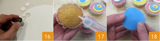 Por último, a branca, corte discos de 3 cm de diâmetro 16 e coloque todos os discos em uma bandeja forrada com papel manteiga. Quando os cupcakes estiverem assados e completamente frios, decore com os discos de pasta de açúcar, colando-os com cola comestível 17; coloque o primeiro disco de pasta de açúcar colorida 18