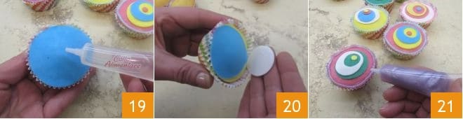 e depois aplique a cola comestível 19 e continue colocando os discos de diferentes tamanhos e cores 20; você pode terminar decorando com lápis brilhantes coloridos 21. Os seus cupcakes optical estão prontos para serem os protagonistas dos seus buffets!