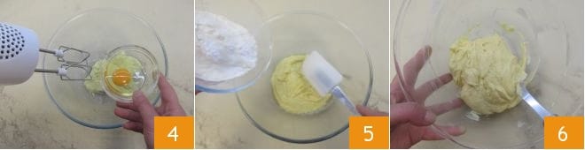 depois acrescente os ovos, um de cada vez, continuando com a batedeira 4. Em uma tigela à parte, peneire a farinha e o fermento, e adicione os ingredientes secos à mistura de manteiga, ovos e açúcar 5, misturando bem todos os ingredientes com uma espátula, até obter uma massa lisa e homogênea 6.