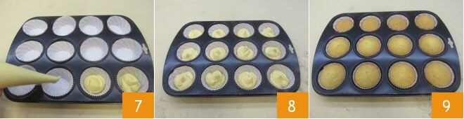 Coloque a massa obtida em um saco de confeitar sem bico, no qual você pode fazer um furo; forre uma forma de muffin com 12 forminhas de papel e, com a ajuda do saco de confeitar, preencha-as até a metade com a massa (7-8). Asse em forno estático pré-aquecido a 180° por 20 minutos (ou a 160° por 10-15 minutos em forno ventilado) até que os cupcakes estejam levemente dourados na superfície. Uma vez prontos 9, desligue e deixe esfriar completamente.