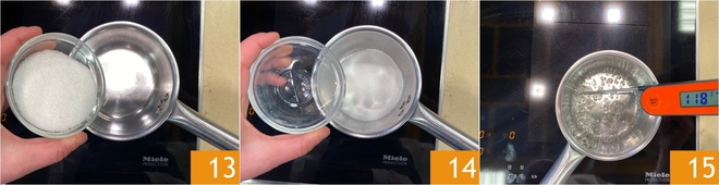 Enquanto isso, cuide do creme de mascarpone: coloque numa panela pequena o açúcar 13 e a água 14; mexa levemente e leve a mistura a 121 b0C, monitorando a temperatura com um termômetro culinário 15; se não tiver termômetro, o xarope estará pronto quando surgirem pequenas bolhas brancas na superfície.<\/p>