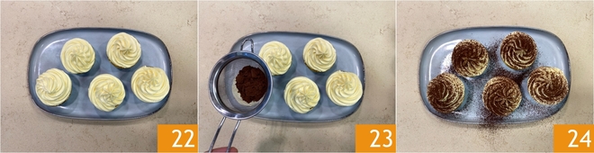 Transfira para um prato de servir 22, decore com cacau em pó amargo 23 e sirva seus cupcakes tiramisù 24!<\/p>