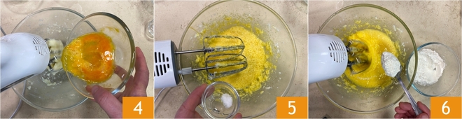 Quando obtiver uma mistura lisa e aerada, junte também os ovos 4 e continue a incorporar com as batedeiras. A esse ponto adicione o sal 5 e a farinha aos poucos, sempre mantendo as batedeiras em funcionamento 6.<\/p>
