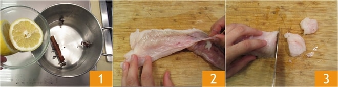 Para preparar o curry de tamboril, em uma panela cheia de água, adicione o limão cortado ao meio, o pau de canela, os cravos-da-índia e o anis-estrelado 1. Leve para ferver, cozinhe por 15 minutos e depois mantenha aquecido. Enquanto isso, cuide do tamboril. Se necessário, remova a espinha central e a pele 2, depois corte em pedaços e reserve 3.