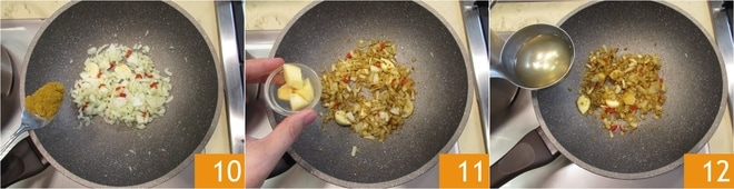 Tempere com o curry 10, a pimenta e o gengibre 11, depois adicione uma concha de água aromatizada 12.