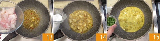 Coloque o tamboril na frigideira 13, salgue e aumente o fogo tentando dourar de todos os lados. Adicione o leite de coco 14 e deixe cozinhar por 10 minutos em fogo médio-baixo, temperando com a salsinha picada 15.