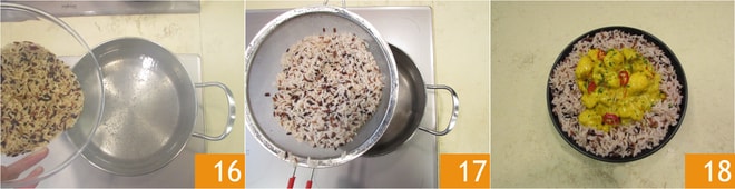 Enquanto isso, cozinhe o arroz por 15 minutos na água fervente aromatizada 16. Depois de cozido, escorra 17 e tempere com duas colheres de sopa de óleo, a casca de limão e meia colher de chá de canela. Coloque o arroz nas tigelas e acompanhe com o curry de tamboril 18.
