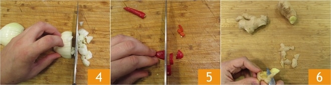 Descasque a cebola e pique-a 4, pique também a pimenta após remover as sementes 5. Descasque o gengibre 6.