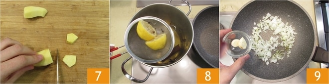 Corte-o em pedaços 7. Remova as especiarias e os aromas da água aromatizada 8. Em seguida, em uma frigideira, coloque um fio de óleo, a cebola e o alho 9.