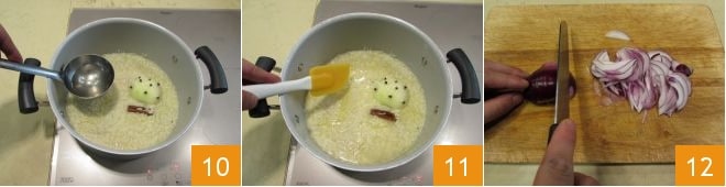 Adicione o pau de canela inteiro, depois coloque conchas de água para favorecer o cozimento 10: adicione uma concha quando a anterior tiver sido absorvida: levará cerca de 10-12 minutos (ou ajuste de acordo com as instruções na embalagem do arroz que você comprar). Sal e pimenta a gosto. Não mexa muito o arroz: será necessário mexê-lo de vez em quando apenas para evitar que grude no fundo da panela. Pouco antes de estar pronto, dê uma última mexida 11 e retire a cebola e o pau de canela. Reserve e prossiga agora com a preparação do grão-de-bico e abóbora: pegue uma cebola e descasque-a, depois corte em fatias bem finas 12.