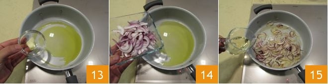 Em uma panela antiaderente e de fundo largo, aqueça o óleo e refogue um dente de alho descascado e inteiro 13. Quando estiver dourado, retire-o e coloque a cebola na panela 14. Refogue com o vinho branco e deixe a cebola amolecer 15.
