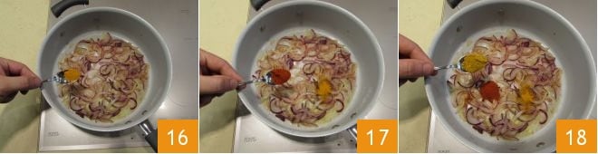 Quando estiver bem amolecida e o líquido evaporado, adicione o açafrão 16. Aromatize também com páprica 17 e curry 18 (a quantidade desses ingredientes pode ser ajustada de acordo com seu gosto pessoal e a intensidade do sabor das especiarias que você usa).