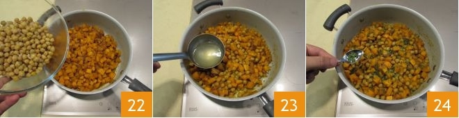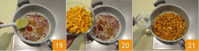 Misture bem os ingredientes 19. Neste ponto, adicione a abóbora: refogue por cerca de 4 minutos 20, temperando com sal e pimenta, e cuidando para mexer bem para evitar que grude no fundo da panela. Em seguida, adicione a água para favorecer o cozimento da abóbora 21 e continue cozinhando em fogo baixo por cerca de 7-8 minutos.