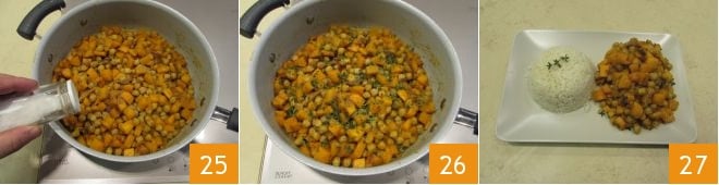 Ajuste o sal 25 e a pimenta: abóbora e grão-de-bico estão prontos agora 26. Neste ponto, você pode servir seu curry vegetariano de abóbora e grão-de-bico: se preferir, você pode formar o arroz pilaf em moldes de alumínio descartáveis para criar uma apresentação impactante 27!