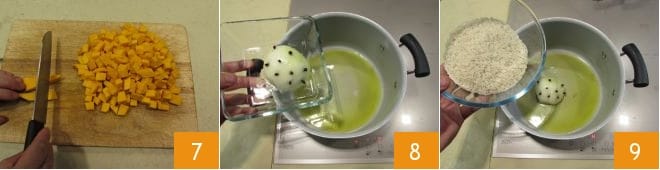 Corte-a em cubos do mesmo tamanho dos grãos-de-bico: isso facilitará obter um cozimento homogêneo. Reserve a abóbora em cubos 7. Pegue uma panela e refogue com um fio de óleo meia cebola descascada na qual você terá espetado os cravos-da-índia 8. Essa técnica serve para não dispersar os cravos na panela (que servem para dar sabor), pois devem ser removidos ao final do cozimento. Adicione então o arroz 9 e toste por alguns minutos, mexendo.