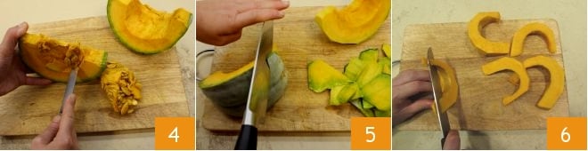 Enquanto os grãos-de-bico cozinham, prepare o Caldo de legumes, então dedique-se à preparação da abóbora: retire as sementes e os filamentos internos 4, elimine a casca externa 5. Depois corte-a em fatias não muito grossas 6.