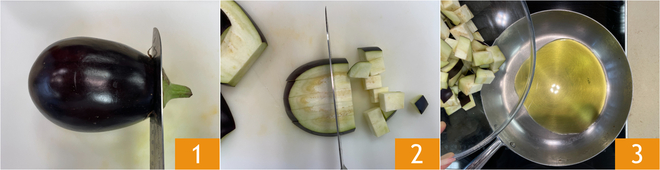 Para preparar o cuscuz com almôndegas de berinjela ao molho, a primeira coisa a fazer é preparar o Caldo de legumes seguindo nossa receita. Elimine o talo das berinjelas 1 e corte-as primeiro em fatias e depois em cubos 2. Em uma frigideira, coloque o óleo e cozinhe as berinjelas 3, um pouco de cada vez, em fogo alto, até que fiquem bem douradas.