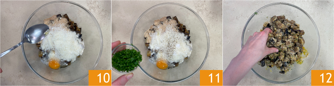 Adicione o alho picado 10 e a salsa picada 11 e misture até obter uma mistura homogênea 12.
