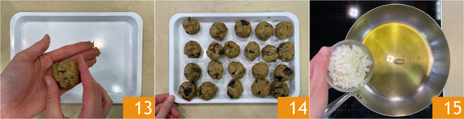 Depois forme as almôndegas 13 e reserve 14. Em uma frigideira, coloque o óleo, adicione o alho e a cebola picada 15 e refogue em fogo médio por alguns minutos, até dourar a cebola.