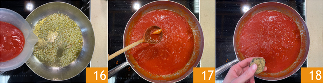 Adicione o molho de tomate 16, algumas folhas de manjericão e cozinhe em fogo baixo por 10-15 minutos. Elimine o alho 17 e adicione as almôndegas 18.