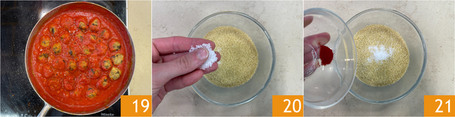 Cozinhe por mais 10-15 minutos, mexendo de vez em quando 19. Em uma tigela, coloque o cuscuz, ajuste o sal 20 e adicione o açafrão 21.