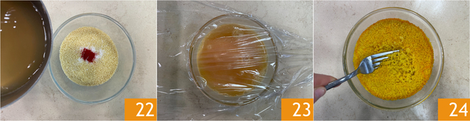 Cubra com o caldo 22, feche com filme plástico 23 ou com uma tampa e deixe descansar por 5 minutos. Após esse tempo, solte o cuscuz com um garfo 24.