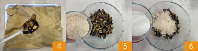 Transfira-as de vez em quando para papel absorvente 4, para eliminar o excesso de óleo, e deixe esfriar. Coloque-as em uma tigela e acrescente a farinha de rosca 5 e o parmesão 6.
