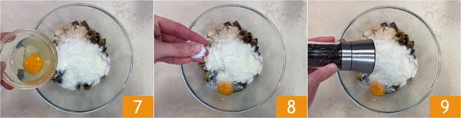 Adicione o ovo 7, ajuste o sal 8 e a pimenta 9.