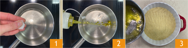 Para preparar o cuscuz com legumes e atum, primeiro coloque a água em uma panela, adicione o sal 1 e o óleo 2 e leve para ferver. Coloque o cuscuz em uma assadeira ou prato grande e despeje a água fervente sobre ele 3.