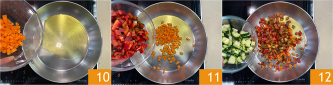 Em uma frigideira, aqueça um fio de óleo, adicione as cenouras 10 e cozinhe por 4 minutos em fogo médio. Depois, adicione os pimentões 11 e as abobrinhas 12.