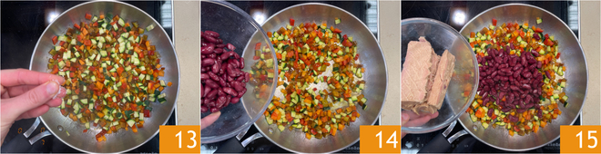 Ajuste o sal 13 e continue cozinhando por cerca de 10 a 15 minutos. Com o fogo desligado, adicione os feijões vermelhos 14 e o atum 15.