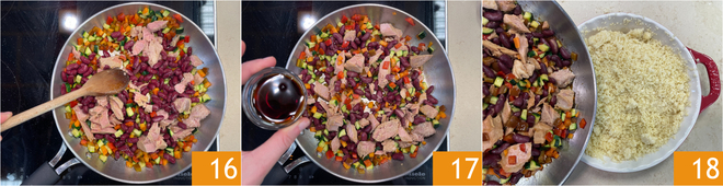 Misture bem, desfiando o atum com a colher 16. Tempere com molho de soja 17 e misture novamente. Neste ponto, você pode temperar o cuscuz 18.