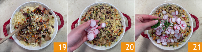 Misture bem tudo 19 e complete com os rabanetes crus 20 e a salsinha picada 21.