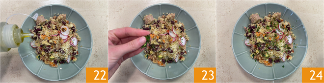 Emprate e decore com um fio de óleo 22 e mais salsinha picada 23. O seu cuscuz com legumes e atum está pronto para ser saboreado 24!