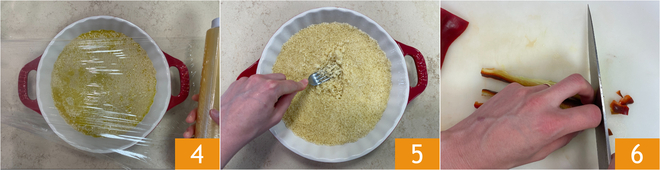 Cubra com filme plástico 4 e deixe descansar por 2 minutos. Verifique na embalagem do cuscuz a quantidade de água a ser utilizada e o tempo de repouso. Uma vez decorrido o tempo necessário, solte o cuscuz com os dentes de um garfo 5 e reserve. Passe para os legumes: retire o pedúnculo, as sementes e os filamentos internos do pimentão, depois corte-o em tiras, depois em tirinhas e depois em cubinhos 6.
