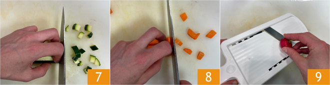Faça o mesmo com as abobrinhas 7 e as cenouras 8. Corte em fatias finas os rabanetes com um mandolim 9.