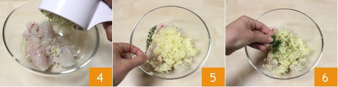Corte a polpa do dourado em pedaços e transfira-a para uma tigela; você precisará de 260 g. Uma vez cozida a batata, descasque-a e amasse-a diretamente na tigela com um espremedor de batatas 4. Salgue e apimente a gosto, depois adicione as folhas de tomilho e a salsa picada (5-6).
