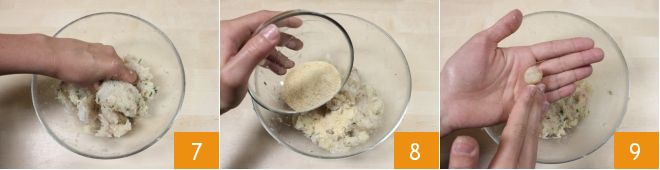 Amasse a mistura à mão 7, adicione a farinha de rosca e trabalhe novamente 8. Em seguida, forme bolinhos de cerca de 5 g cada 9.