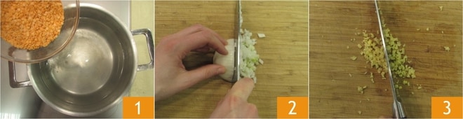 Para preparar o dahl de lentilhas vermelhas, primeiro ferva as lentilhas em uma panela com bastante água pelo tempo indicado na embalagem 1. Enquanto isso, pique finamente a cebola 2 e o gengibre 3.