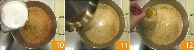 Adicione também o leite de coco 10 e as sementes de cominho torradas 11, depois aromatize com a cúrcuma 12.