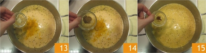 Adicione o restante das especiarias em pó: o alho em pó 13, o garam masala 14 e a pimenta 15.
