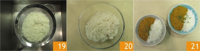 Depois de cozido, escorra o arroz basmati 19 e reserve em uma tigela 20. Quando as lentilhas atingirem uma consistência cremosa, você pode servir seu dahl de lentilhas vermelhas acompanhado de arroz basmati 21!