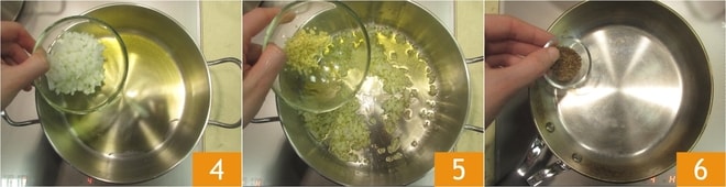 Aqueça um fio de azeite em uma caçarola, depois adicione a cebola 4 e o gengibre 5 e refogue suavemente. Enquanto isso, torre as sementes de cominho em uma panela à parte 6.