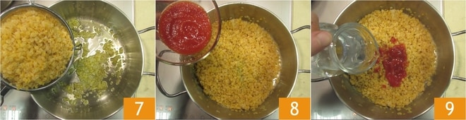 Passado o tempo de cozimento, escorra as lentilhas e coloque-as na caçarola 7. Adicione o purê de tomate 8 e a água 9.