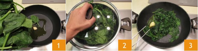 Para preparar o danúbio rápido de Natal, comece cuidando do espinafre: lave as folhas, depois em uma panela aqueça um fio de azeite com o alho e adicione o espinafre 1. Cubra com uma tampa 2 e deixe murchar em fogo alto por cerca de 5 minutos, depois retire o alho e desligue o fogo 3.