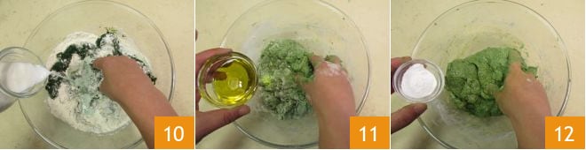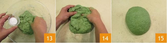 Por fim, incorpore o sal 13 e termine de amassar em uma bancada 14. Forme uma massa homogênea 15.